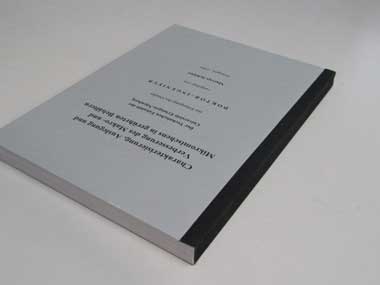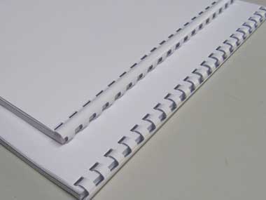 mit Plastikbinderücken (Rückenfarbe weiß; andere Farben auf Anfrage), besonders geeignet für Handbücher, die oft benutzt werden. Zusätzlich kann ein Abheftstreifen mitgebunden werden, um die Bindung in einen Ordner abzulegen. Der Vorteil dieser Bindeart liegt in der einfachen Handhabung und in der Strapazierfähigkeit des Materials. Zudem können Sie nachträglich Seiten einfügen oder austauschen lassen oder einen Abheftstreifen zur Ablage im Ordner einbinden. Muster
